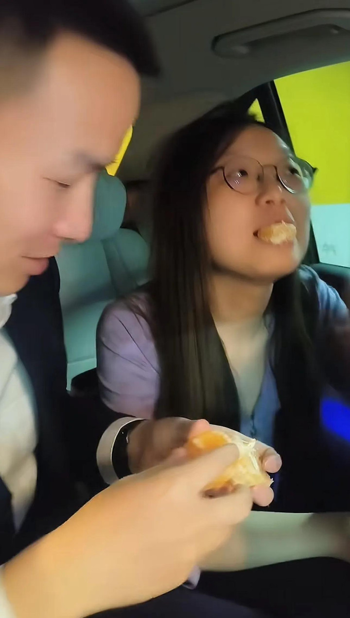 他小心地将橙子掰开,把两片鲜亮的果肉递向前座。
