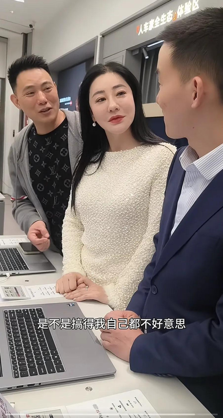 长发飘逸的大姐正徘徊在一台灰色平板电脑前,流连不舍。