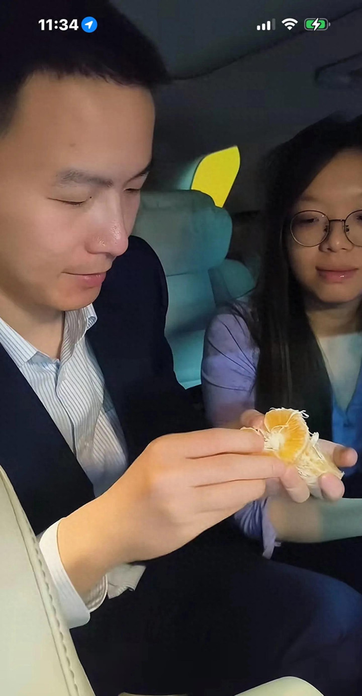 后座上的谢浩男盯着手中的蜜橙,手法娴熟地剥去橙皮。
